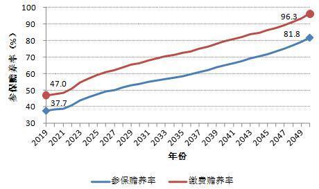 报告预测显示,2019年“参保赡养率”和“缴费赡养率”分别为37.7%和47.0%,然后同时缓慢上升再加速上升,从2023年后便开始一路平稳上升,到2043年后有加速迹象,到2050年分别达到81.8%和96.3%。
